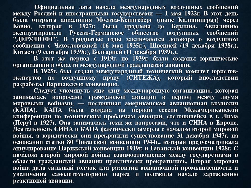 Официальная дата начала международных воздушных сообщениймежду Россией и иностранными государствами — 1 мая 1922г. В этот день