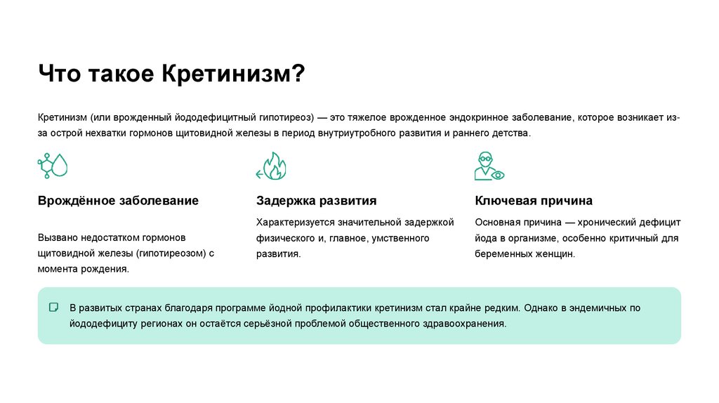 Что такое Кретинизм?Кретинизм (или врожденный йододефицитный гипотиреоз) — это тяжелое врожденное эндокринное заболевание, которое возникает изза острой нехватки гормонов щитовидной железы в период внутриутробного развития и раннего детства.