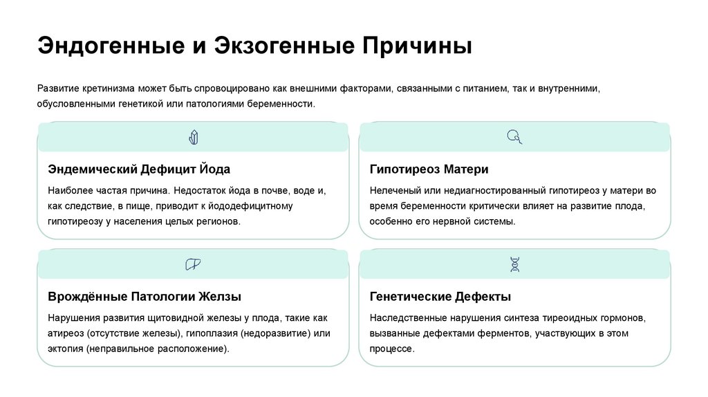 Эндогенные и Экзогенные ПричиныРазвитие кретинизма может быть спровоцировано как внешними факторами, связанными с питанием, так и внутренними,