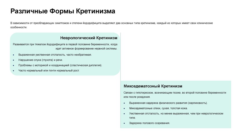 Различные Формы КретинизмаВ зависимости от преобладающих симптомов и степени йододефицита выделяют два основных типа кретинизма, каждый из которых имеет свои клинические