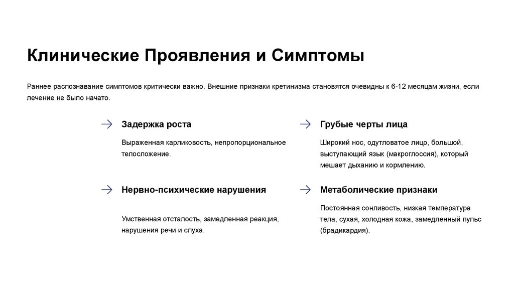 Клинические Проявления и СимптомыРаннее распознавание симптомов критически важно. Внешние признаки кретинизма становятся очевидны к 6-12 месяцам жизни, если