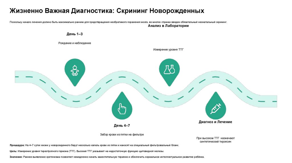 Значение: Раннее выявление кретинизма позволяет немедленно начать заместительную терапию и обеспечить нормальное интеллектуальное развитие ребёнка.
