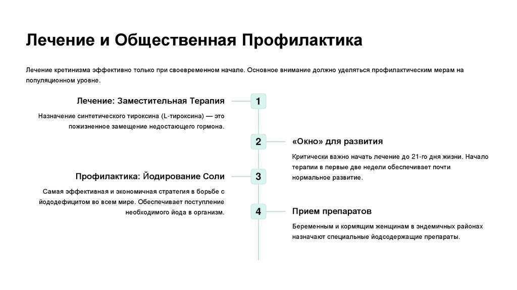 Лечение и Общественная ПрофилактикаЛечение кретинизма эффективно только при своевременном начале. Основное внимание должно уделяться профилактическим мерам на