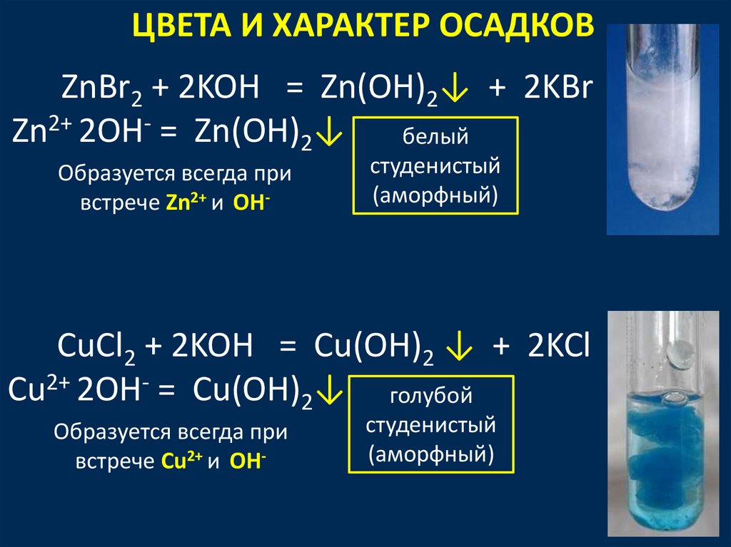 ЦВЕТА И ХАРАКТЕР ОСАДКОВZnBr2 + 2KOH = Zn(OH)2↓ + 2KBr