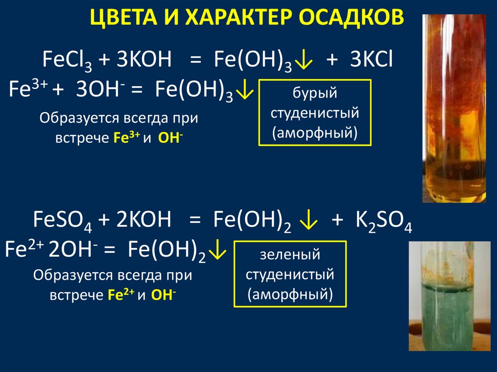 ЦВЕТА И ХАРАКТЕР ОСАДКОВFeCl3 + 3KOH = Fe(OH)3↓ + 3KCl