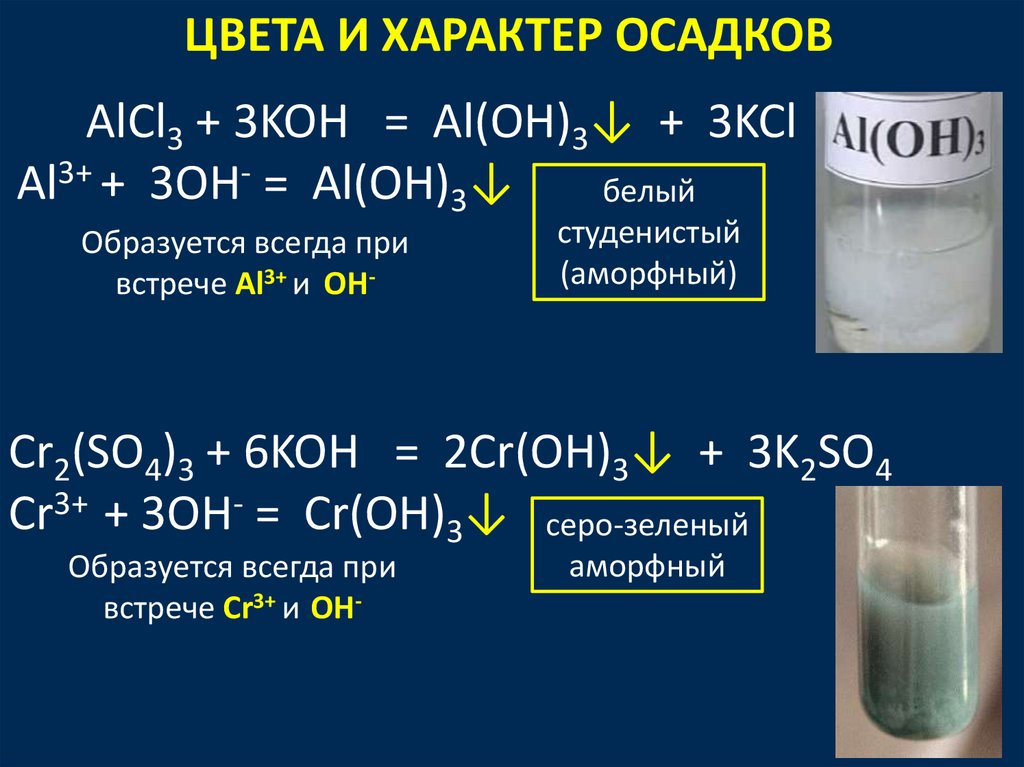ЦВЕТА И ХАРАКТЕР ОСАДКОВAlCl3 + 3KOH = Al(OH)3↓ + 3KCl