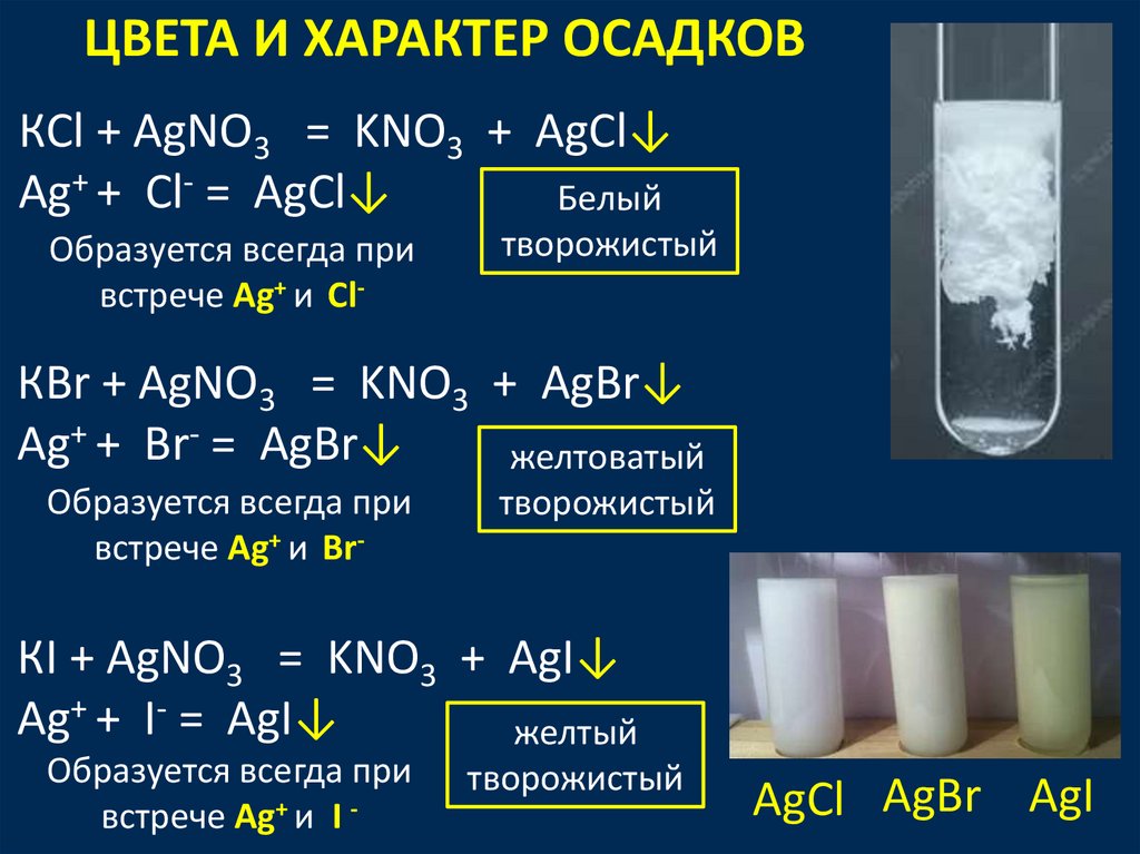 ЦВЕТА И ХАРАКТЕР ОСАДКОВКCl + AgNO3 = KNO3 + AgCl↓