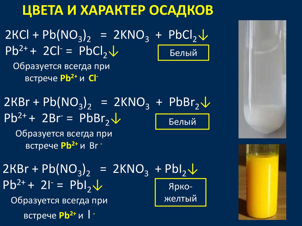 ЦВЕТА И ХАРАКТЕР ОСАДКОВ2КCl + Pb(NO3)2 = 2KNO3 + PbCl2↓