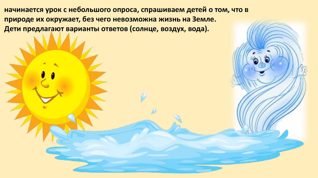 начинается урок с небольшого опроса, спрашиваем детей о том, что вприроде их окружает, без чего невозможна жизнь на Земле.