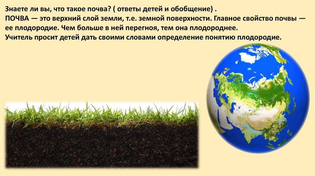 Знаете ли вы, что такое почва? ( ответы детей и обобщение) .ПОЧВА — это верхний слой земли, т.е. земной поверхности. Главное свойство почвы —