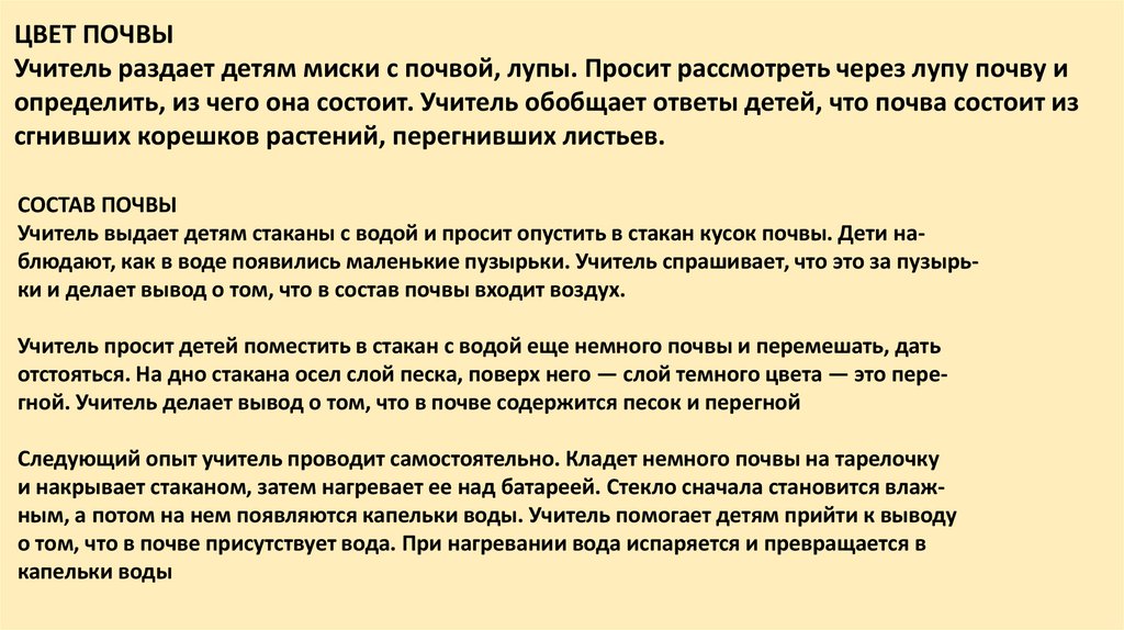 Учитель выдает детям стаканы с водой и просит опустить в стакан кусок почвы. Дети наблюдают, как в воде появились маленькие пузырьки. Учитель спрашивает, что это за пузырьки и делает вывод о том, что в состав почвы входит воздух.