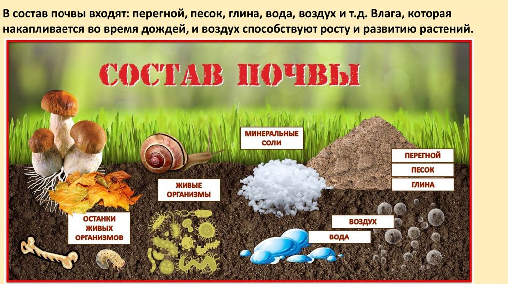В состав почвы входят: перегной, песок, глина, вода, воздух и т.д. Влага, котораянакапливается во время дождей, и воздух способствуют росту и развитию растений.
