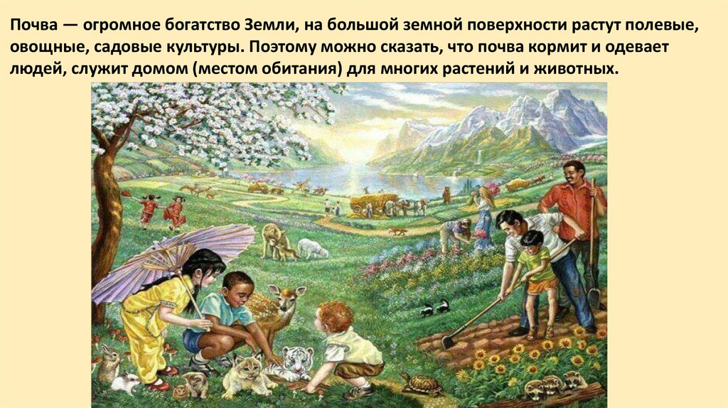 Почва — огромное богатство Земли, на большой земной поверхности растут полевые,овощные, садовые культуры. Поэтому можно сказать, что почва кормит и одевает