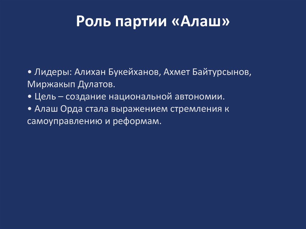 Роль партии «Алаш»• Лидеры: Алихан Букейханов, Ахмет Байтурсынов,