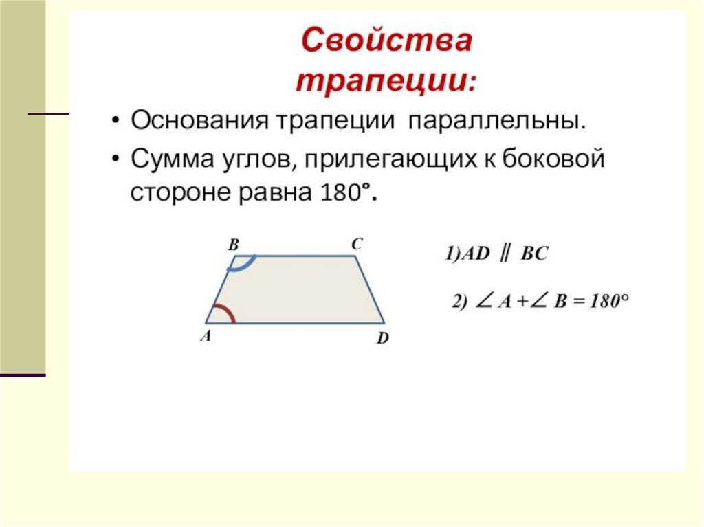 8.1.1.11 знать определение,виды и свойства трапеции;