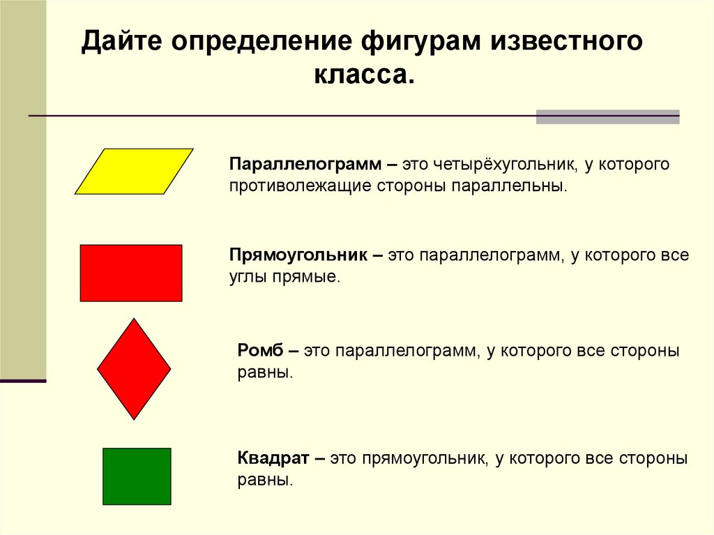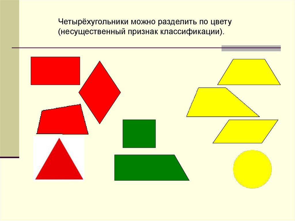 Четырёхугольники можно разделить по цвету(несущественный признак классификации).