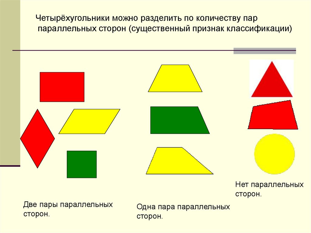 Четырёхугольники можно разделить по количеству парпараллельных сторон (существенный признак классификации)