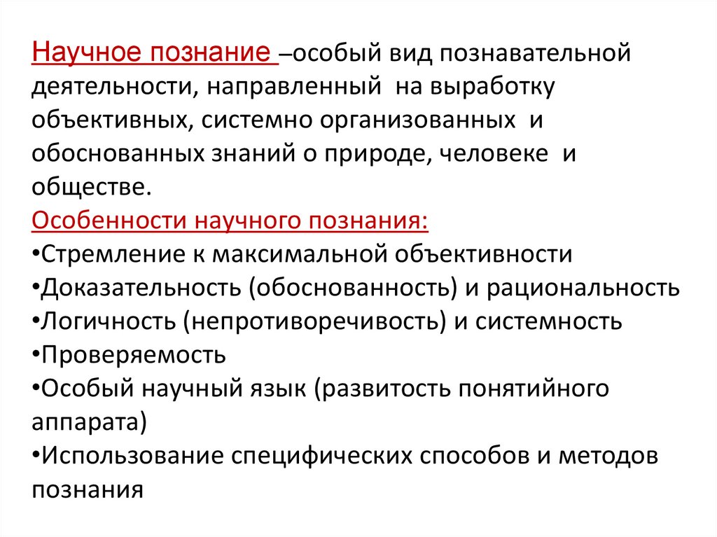 Научное познание –особый вид познавательнойдеятельности, направленный на выработку