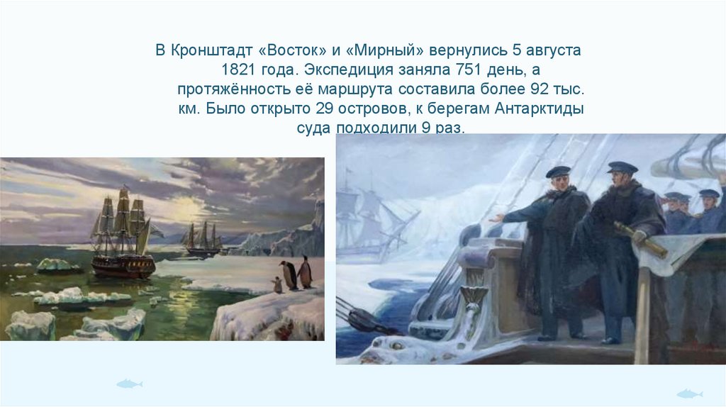 В Кронштадт «Восток» и «Мирный» вернулись 5 августа1821 года. Экспедиция заняла 751 день, а