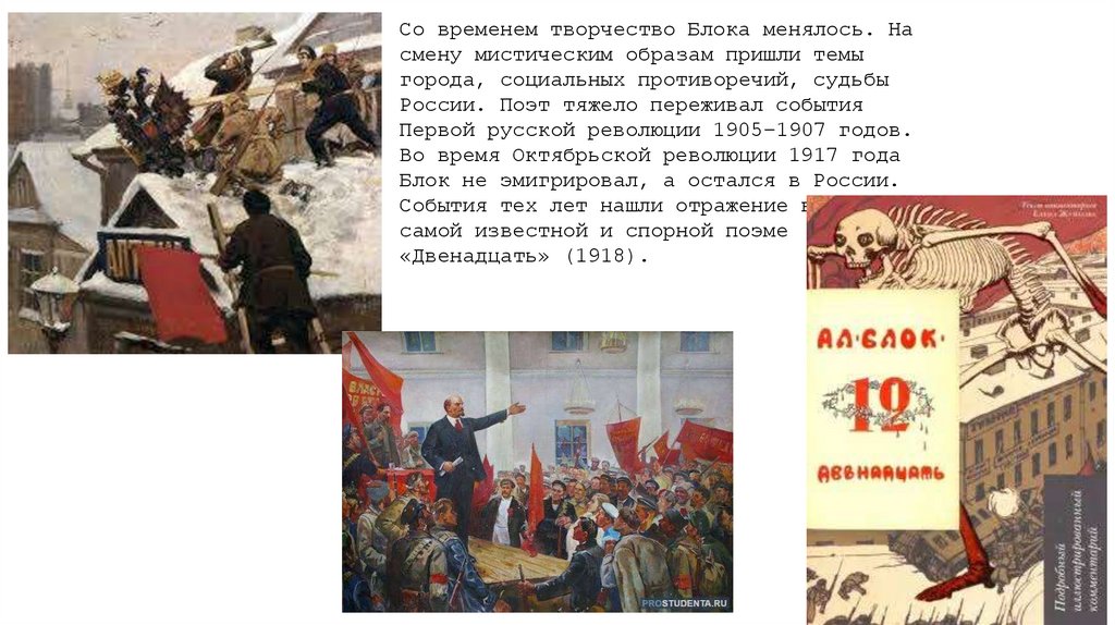 Со временем творчество Блока менялось. Насмену мистическим образам пришли темы