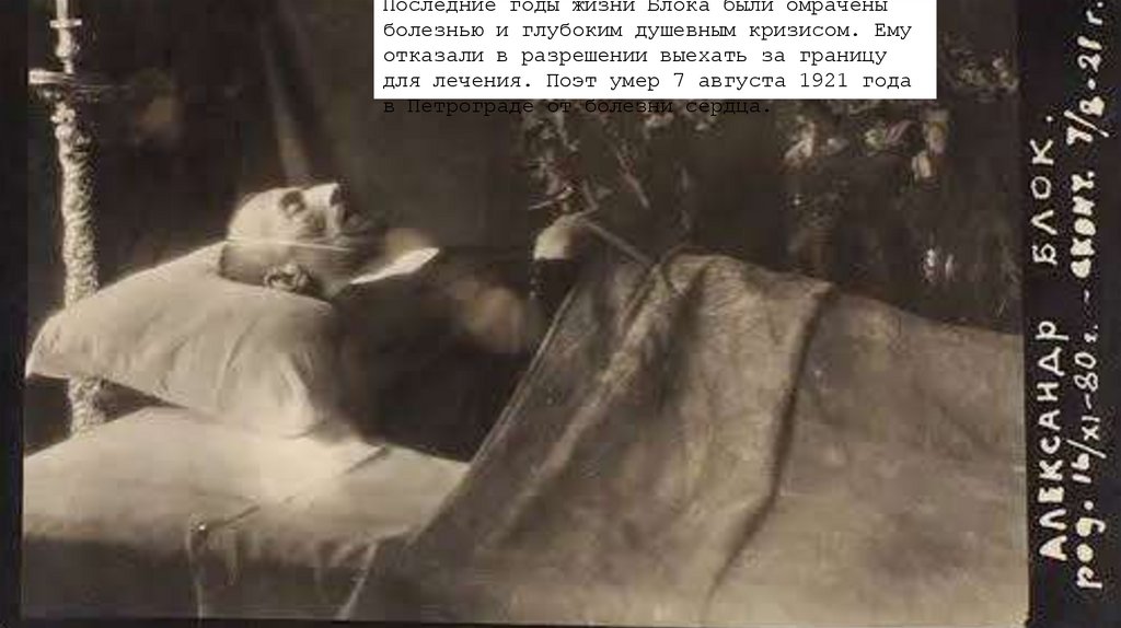 Последние годы жизни Блока были омраченыболезнью и глубоким душевным кризисом. Ему