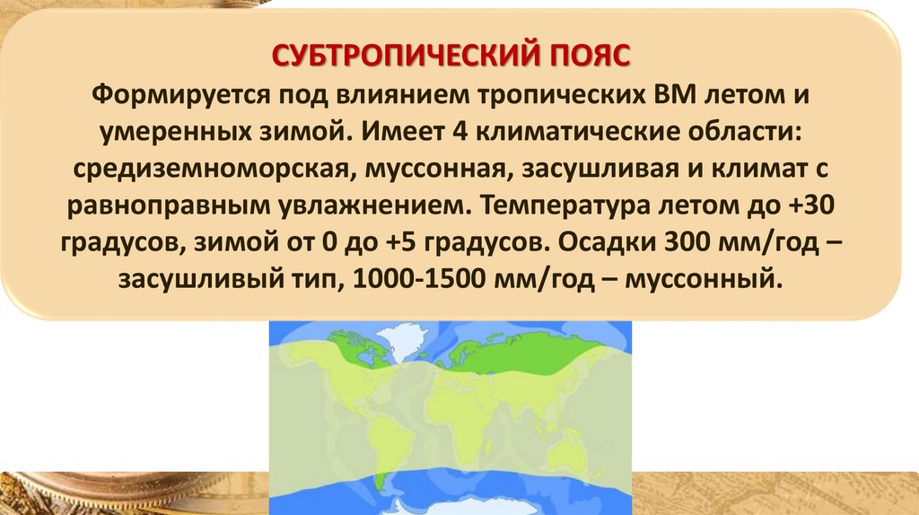 СУБТРОПИЧЕСКИЙ ПОЯСФормируется под влиянием тропических ВМ летом и