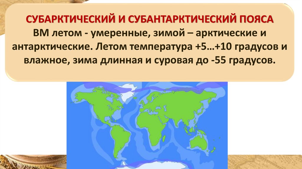 СУБАРКТИЧЕСКИЙ И СУБАНТАРКТИЧЕСКИЙ ПОЯСАВМ летом - умеренные, зимой – арктические и