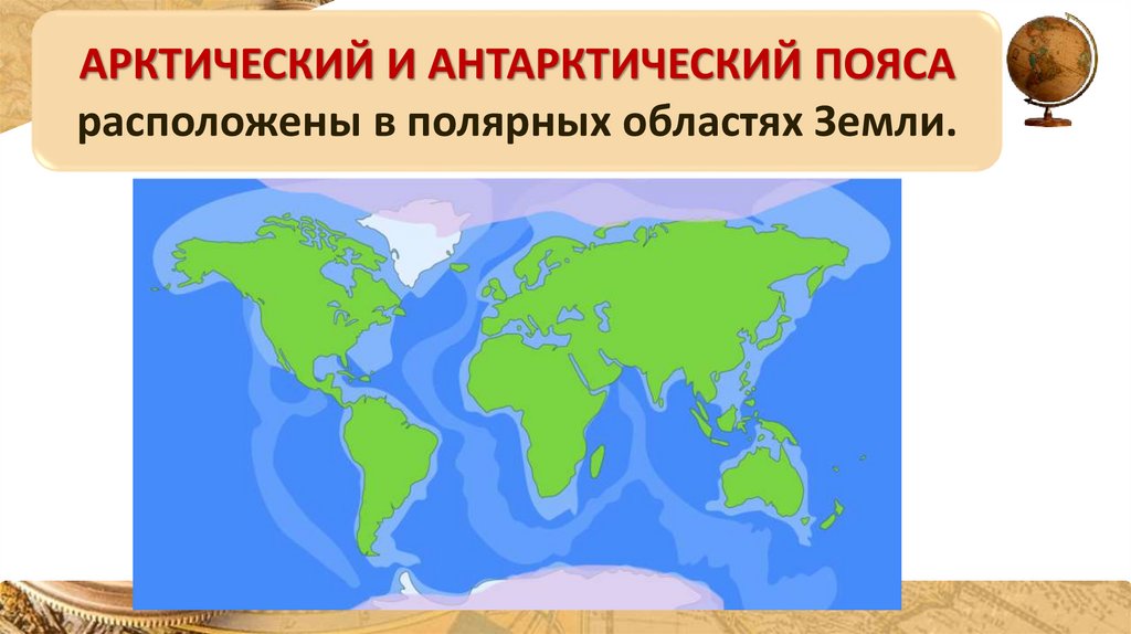 АРКТИЧЕСКИЙ И АНТАРКТИЧЕСКИЙ ПОЯСАрасположены в полярных областях Земли.