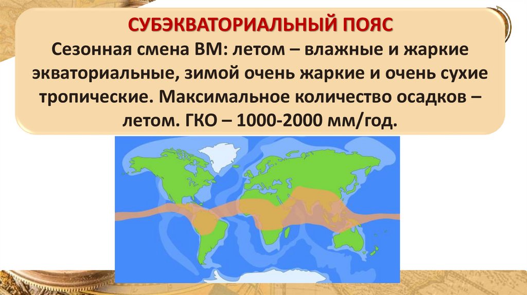 СУБЭКВАТОРИАЛЬНЫЙ ПОЯССезонная смена ВМ: летом – влажные и жаркие
