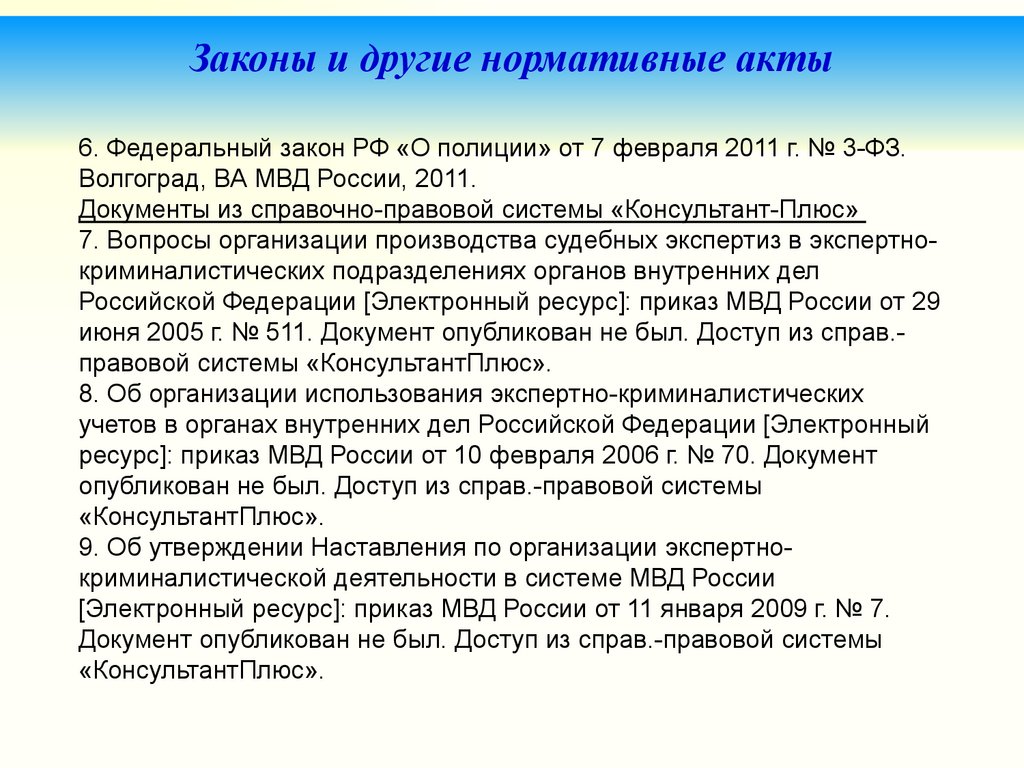 Законы и другие нормативные акты6. Федеральный закон РФ «О полиции» от 7 февраля 2011 г. № 3-ФЗ.