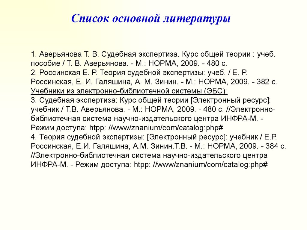 Список основной литературы1. Аверьянова Т. В. Судебная экспертиза. Курс общей теории : учеб.