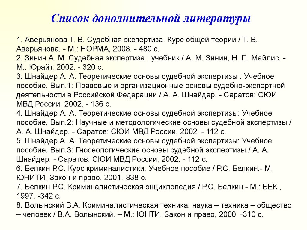 Список дополнительной литературы1. Аверьянова Т. В. Судебная экспертиза. Курс общей теории / Т. В.