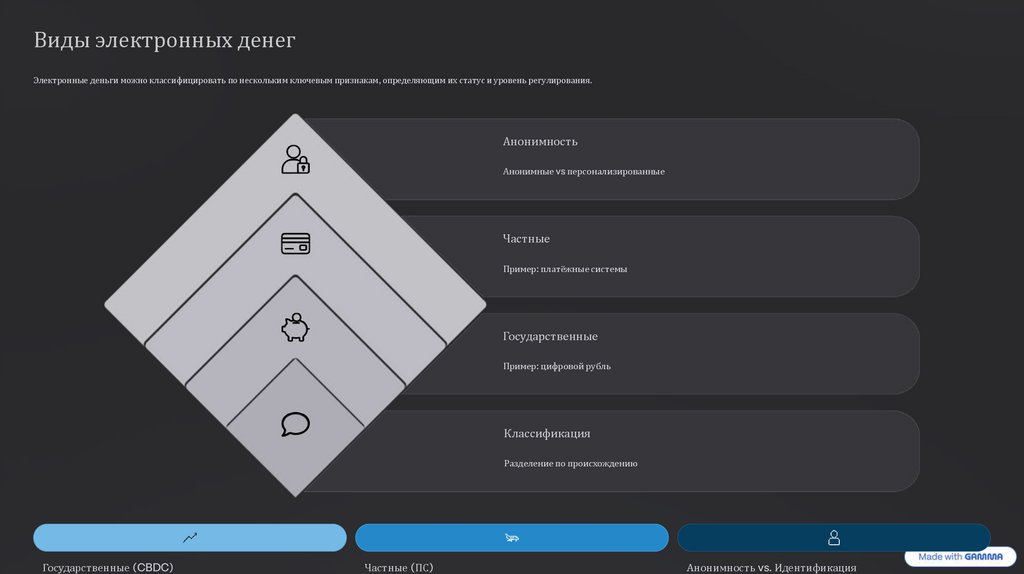 Виды электронных денегЭлектронные деньги можно классифицировать по нескольким ключевым признакам, определяющим их статус и уровень регулирования.