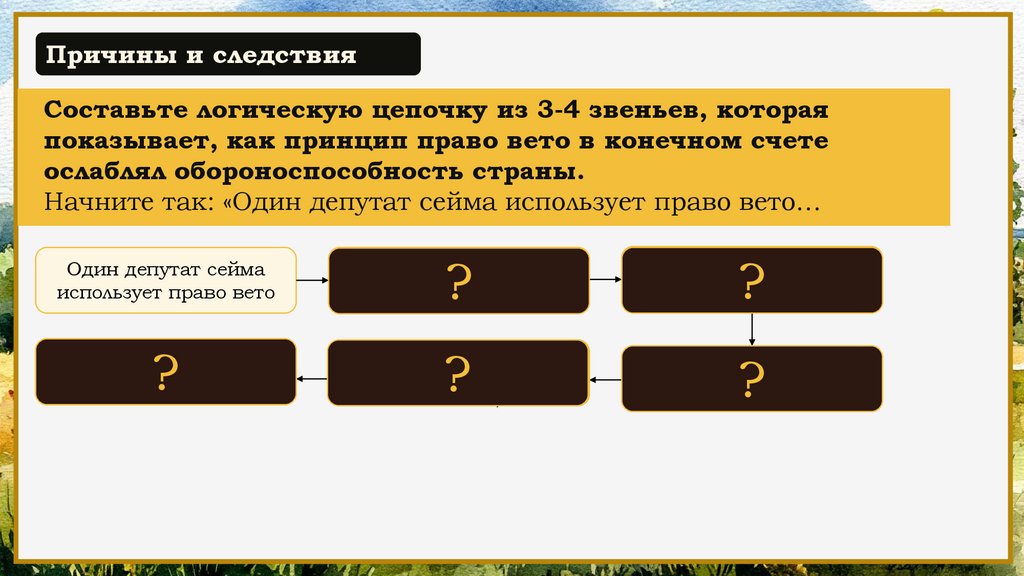 Причины и следствияСоставьте логическую цепочку из 3-4 звеньев, которая