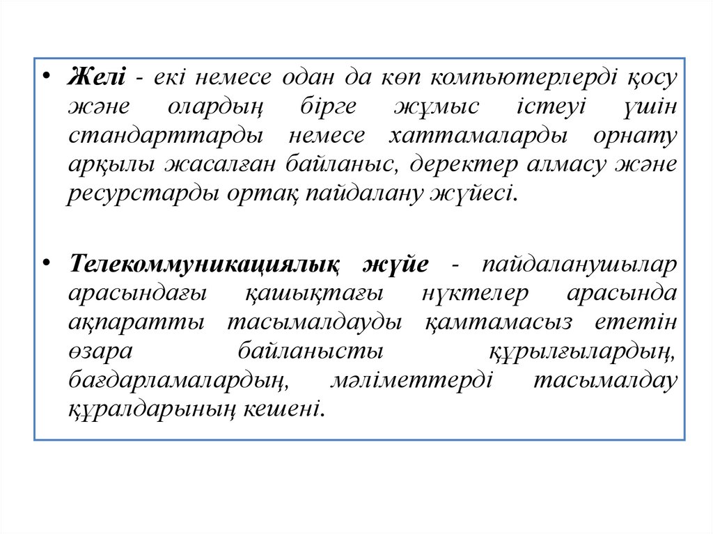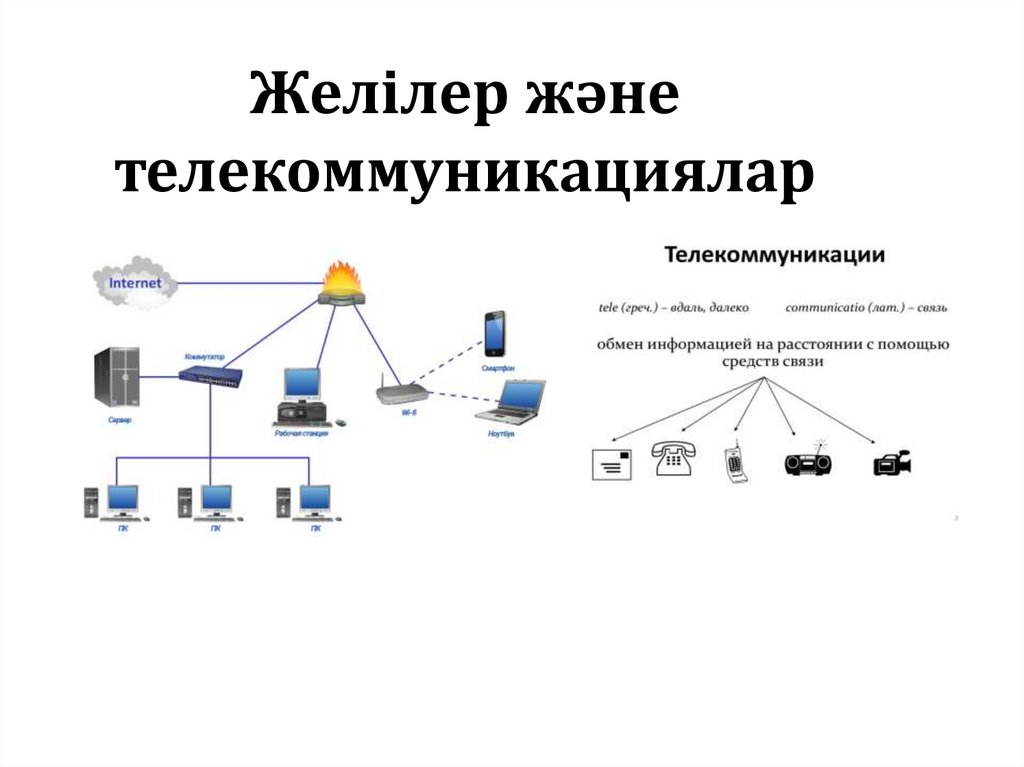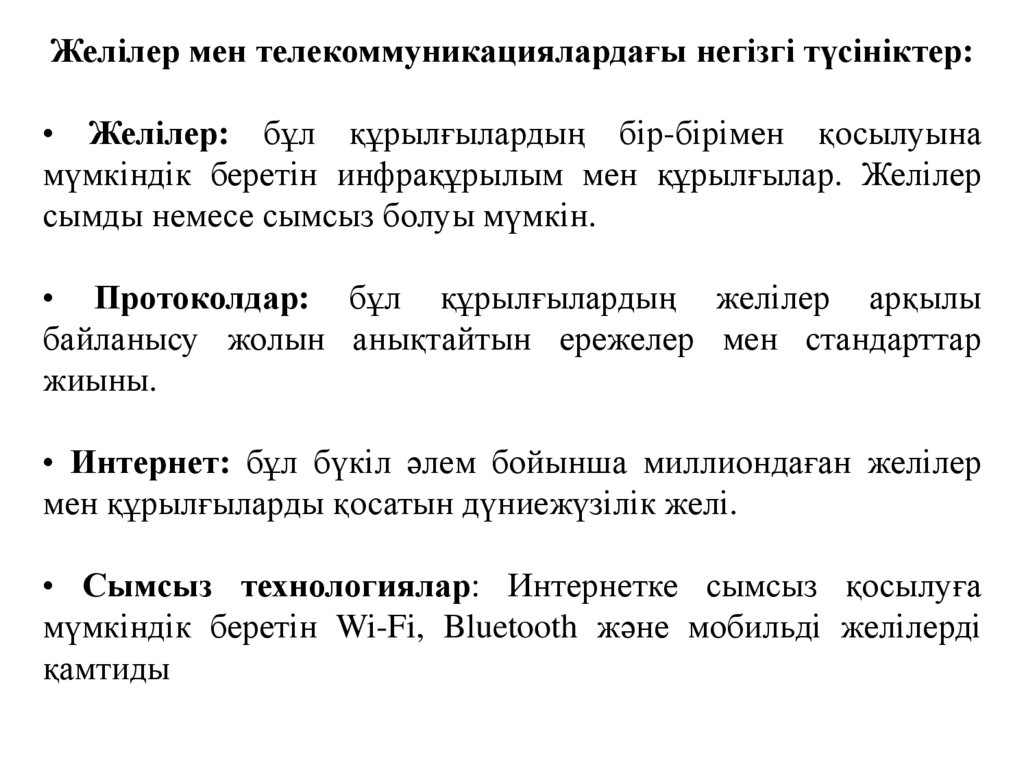 Желілер мен телекоммуникациялардағы негізгі түсініктер:• Желілер: бұл құрылғылардың бір-бірімен қосылуына