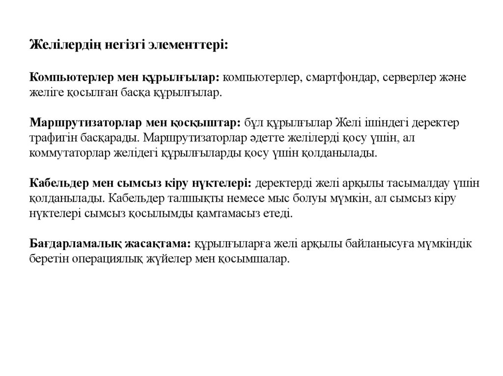 Желілердің негізгі элементтері:Компьютерлер мен құрылғылар: компьютерлер, смартфондар, серверлер және