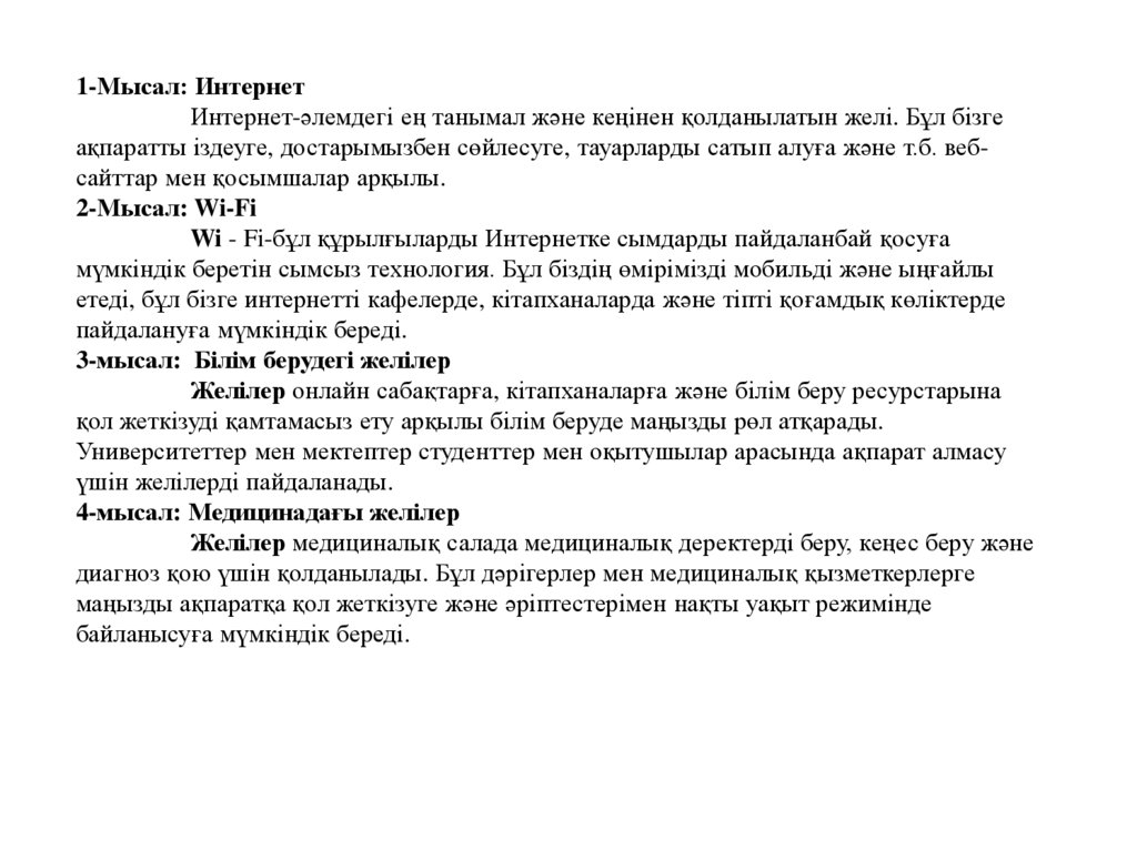 1-Мысал: ИнтернетИнтернет-әлемдегі ең танымал және кеңінен қолданылатын желі. Бұл бізге