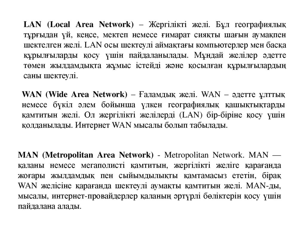 • Желілердің үш түрі бар:1. Жергілікті желі (LAN)