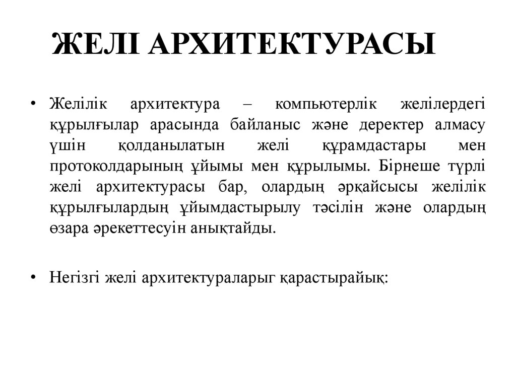 ЖЕЛІ АРХИТЕКТУРАСЫ• Желілік архитектура – компьютерлік желілердегі