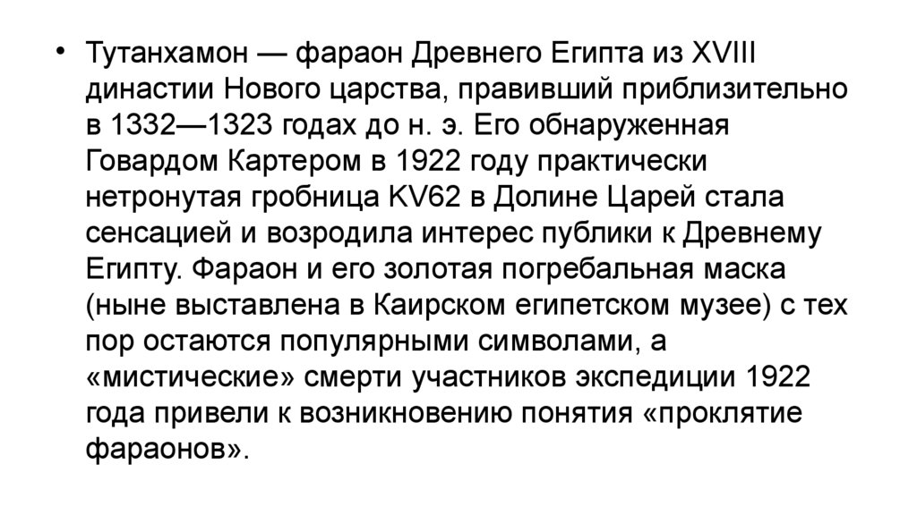 Тутанхамон — фараон Древнего Египта из XVIIIдинастии Нового царства, правивший приблизительно