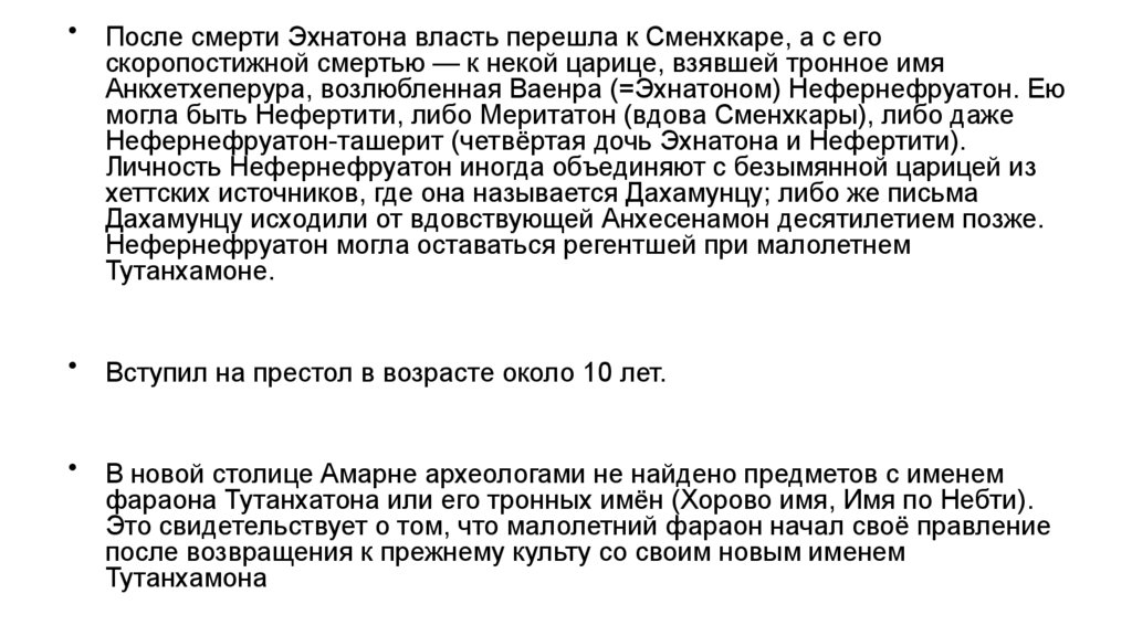 После смерти Эхнатона власть перешла к Сменхкаре, а с егоскоропостижной смертью — к некой царице, взявшей тронное имя