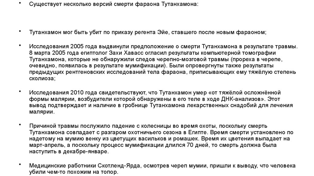 Существует несколько версий смерти фараона Тутанхамона:Тутанхамон мог быть убит по приказу регента Эйе, ставшего после новым фараоном;