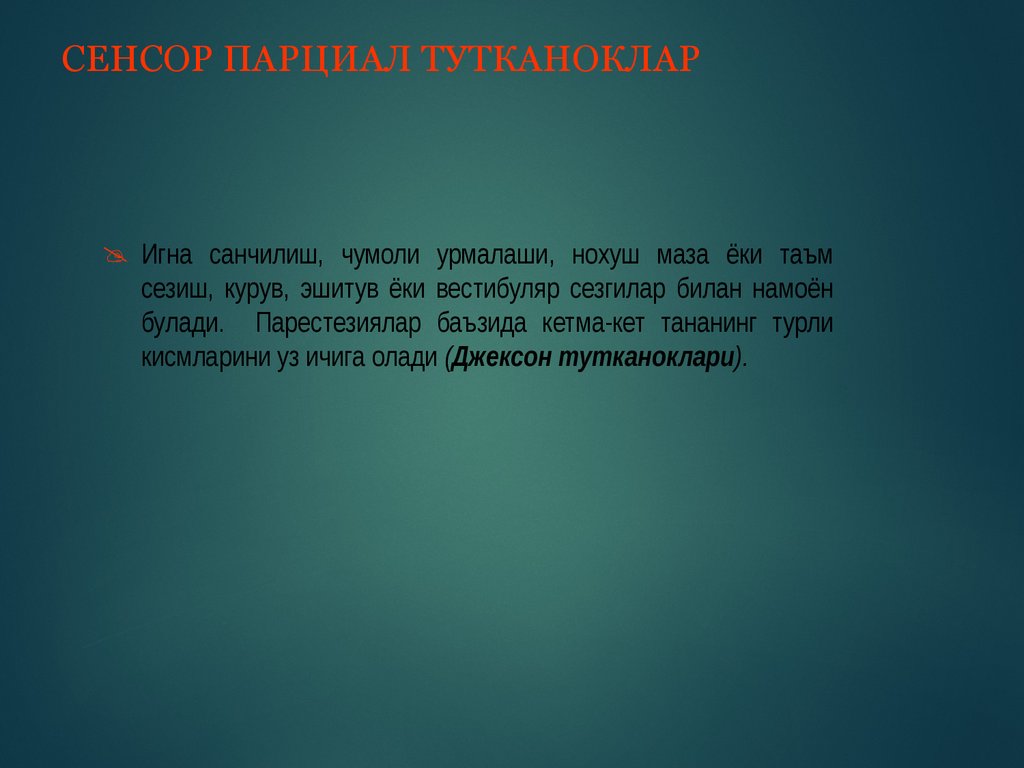 СЕНСОР ПАРЦИАЛ ТУТКАНОКЛАРИгна санчилиш, чумоли урмалаши, нохуш маза ёки таъм
