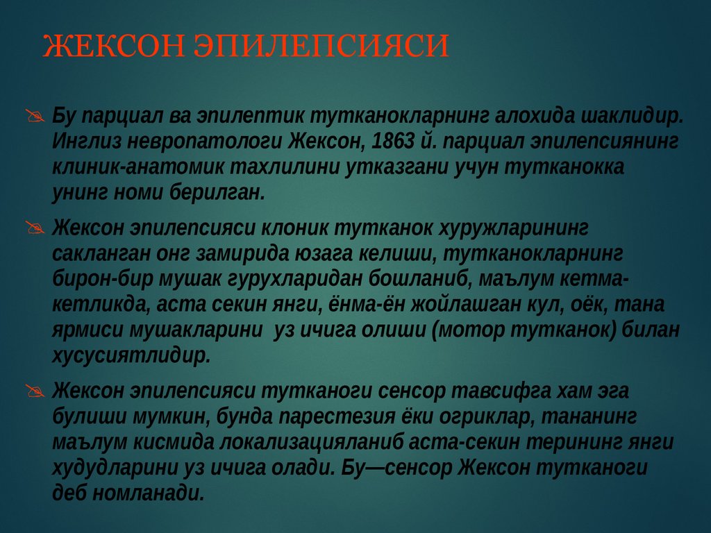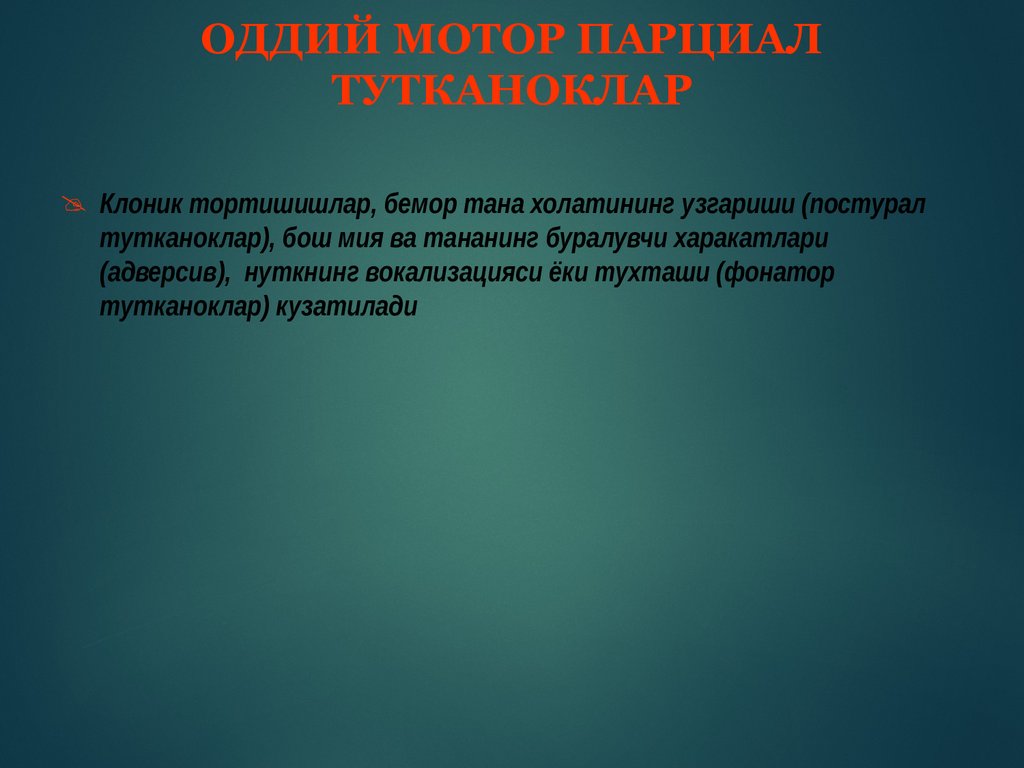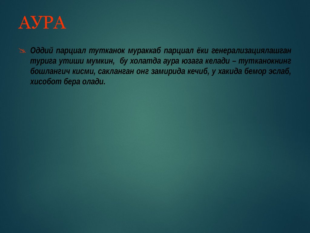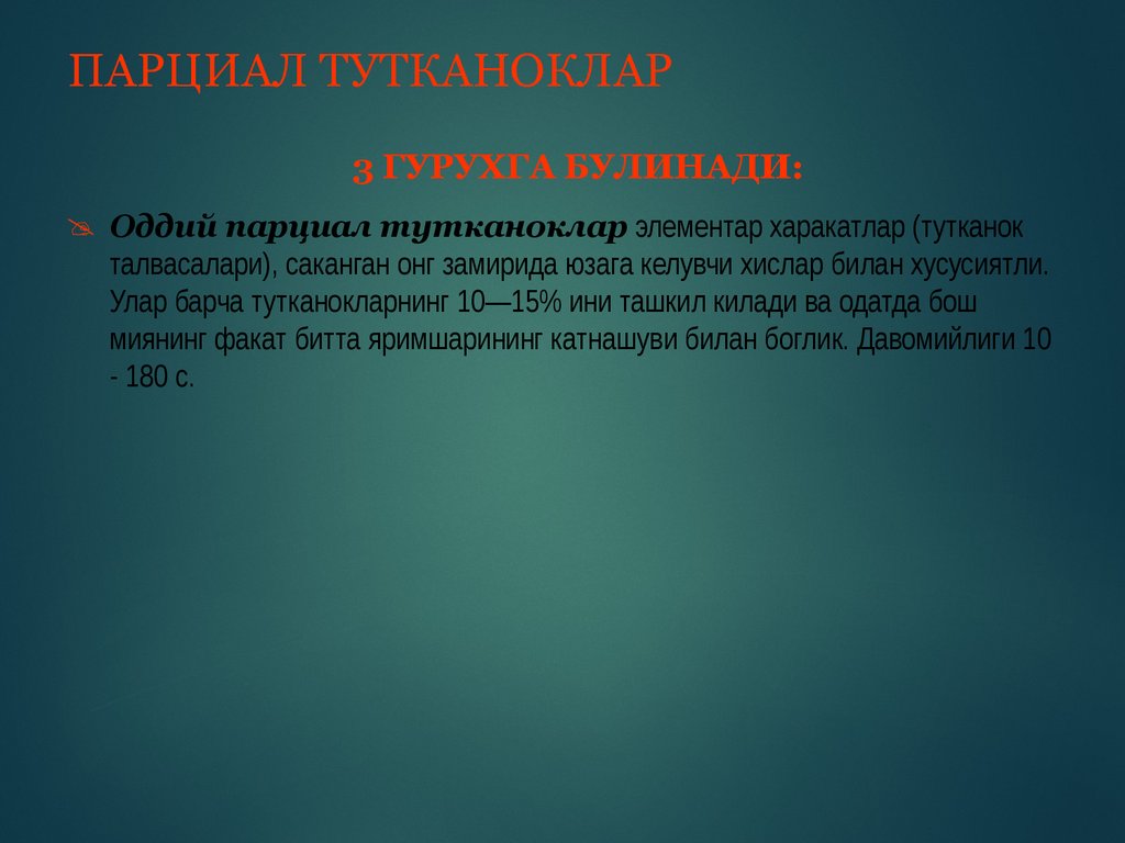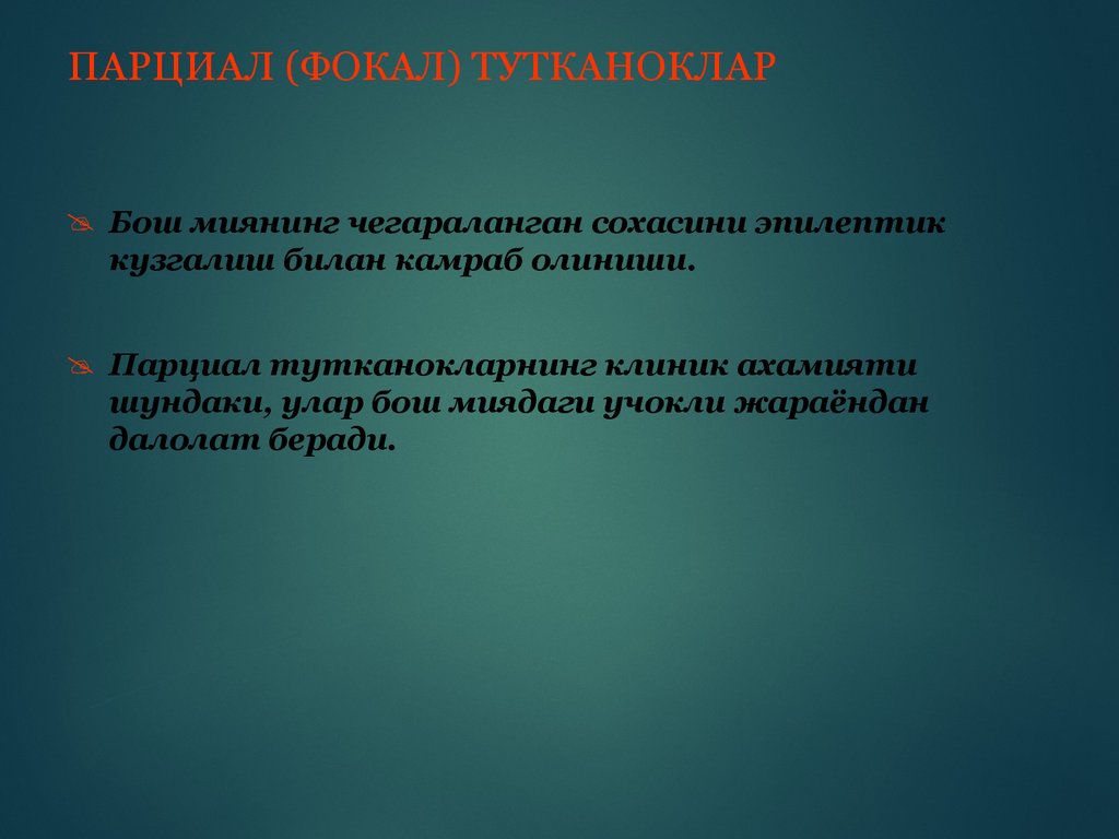 ПАРЦИАЛ (ФОКАЛ) ТУТКАНОКЛАРБош миянинг чегараланган сохасини эпилептик