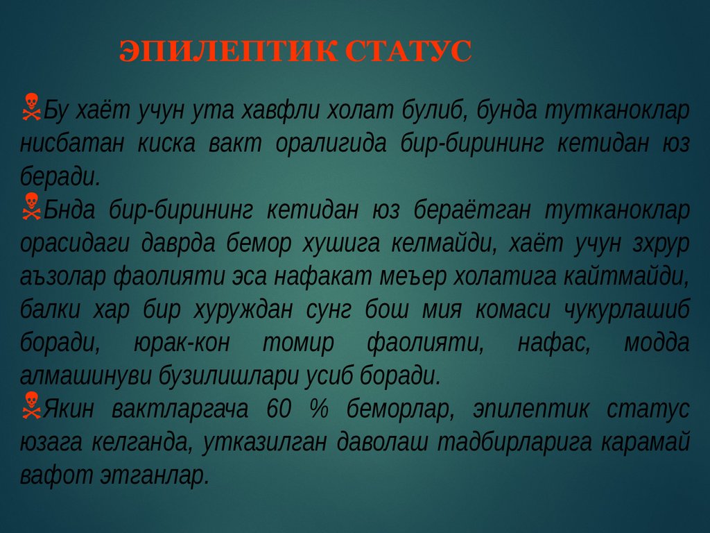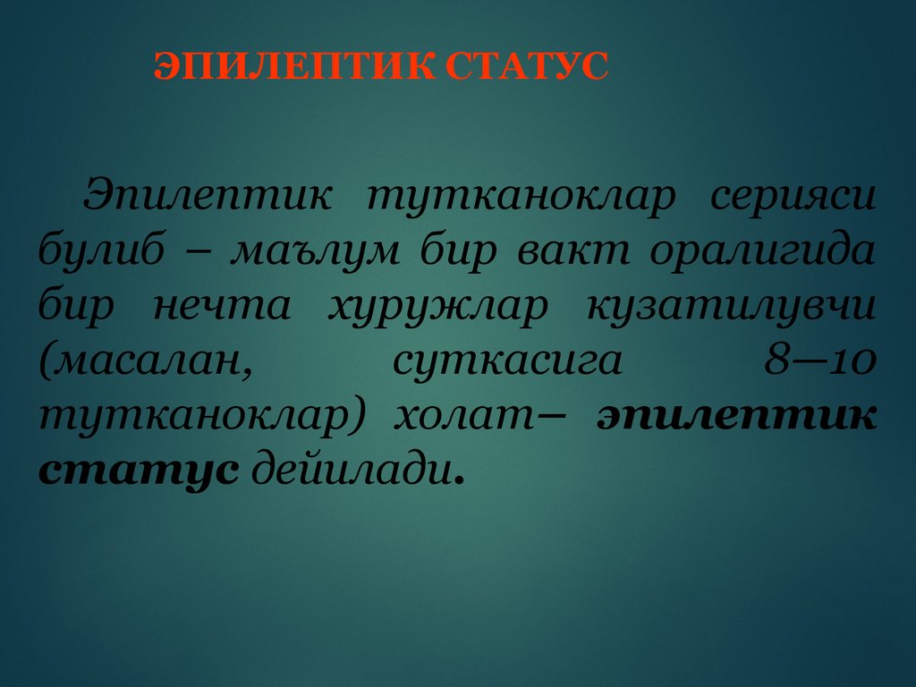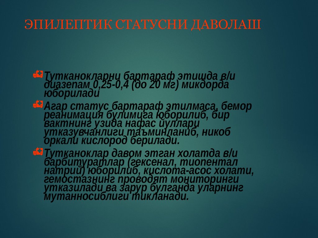 ЭПИЛЕПТИК СТАТУСНИ ДАВОЛАШТутканокларни бартараф этишда в/и