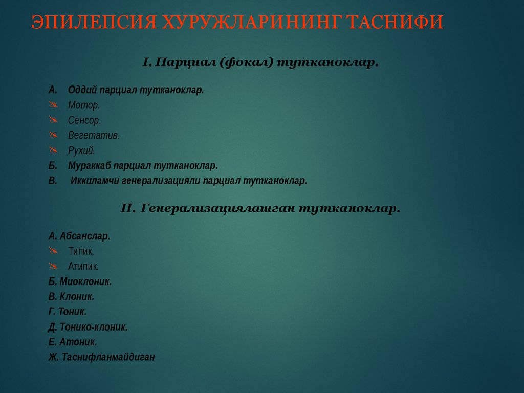 ЭПИЛЕПСИЯ ХУРУЖЛАРИНИНГ ТАСНИФИI. Парциал (фокал) тутканоклар.
