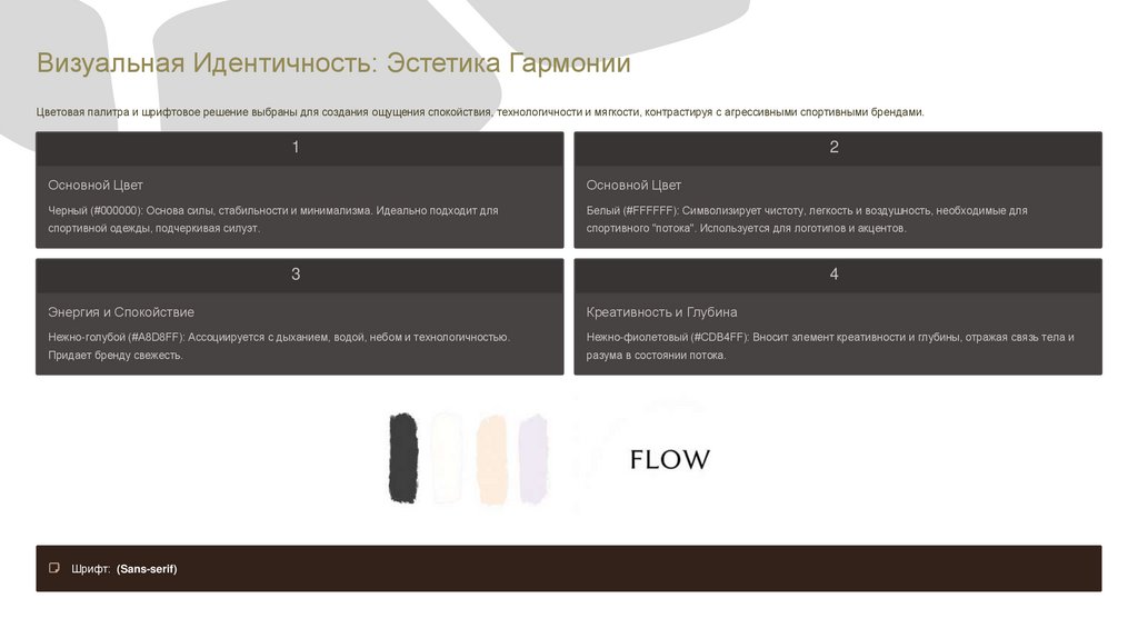 Визуальная Идентичность: Эстетика ГармонииЦветовая палитра и шрифтовое решение выбраны для создания ощущения спокойствия, технологичности и мягкости, контрастируя с агрессивными спортивными брендами.