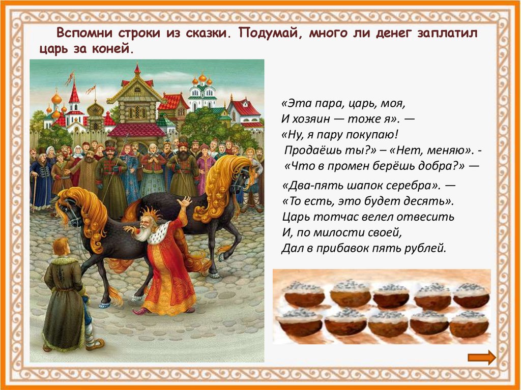 Вспомни строки из сказки. Подумай, много ли денег заплатилцарь за коней.