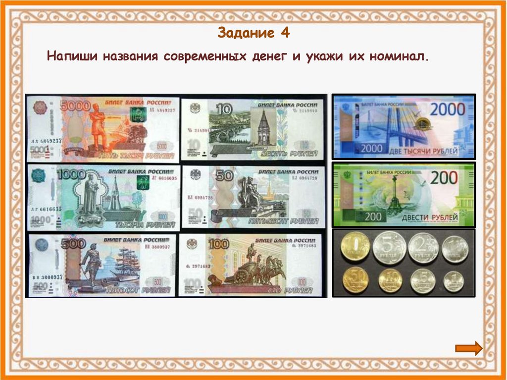 Задание 4Напиши названия современных денег и укажи их номинал.