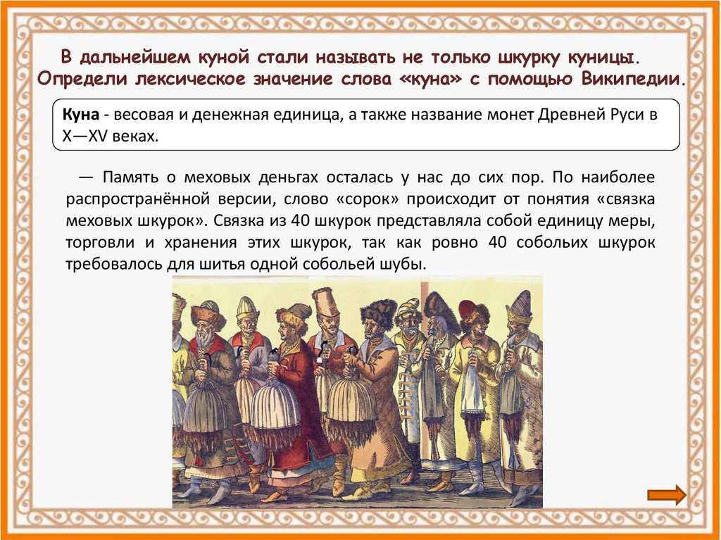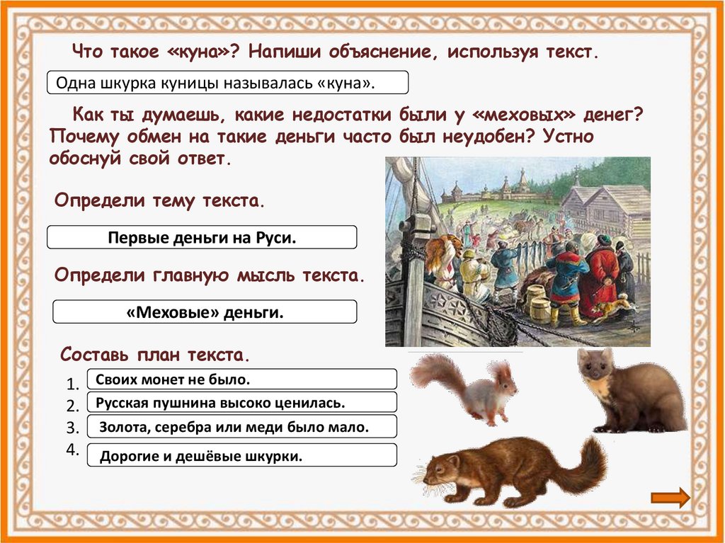 Что такое «куна»? Напиши объяснение, используя текст.Одна шкурка куницы называлась «куна».